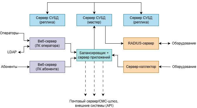 - Веб‑сервер личного кабинета оператора — веб‑интерфейс сотрудника, работающего с биллингом.